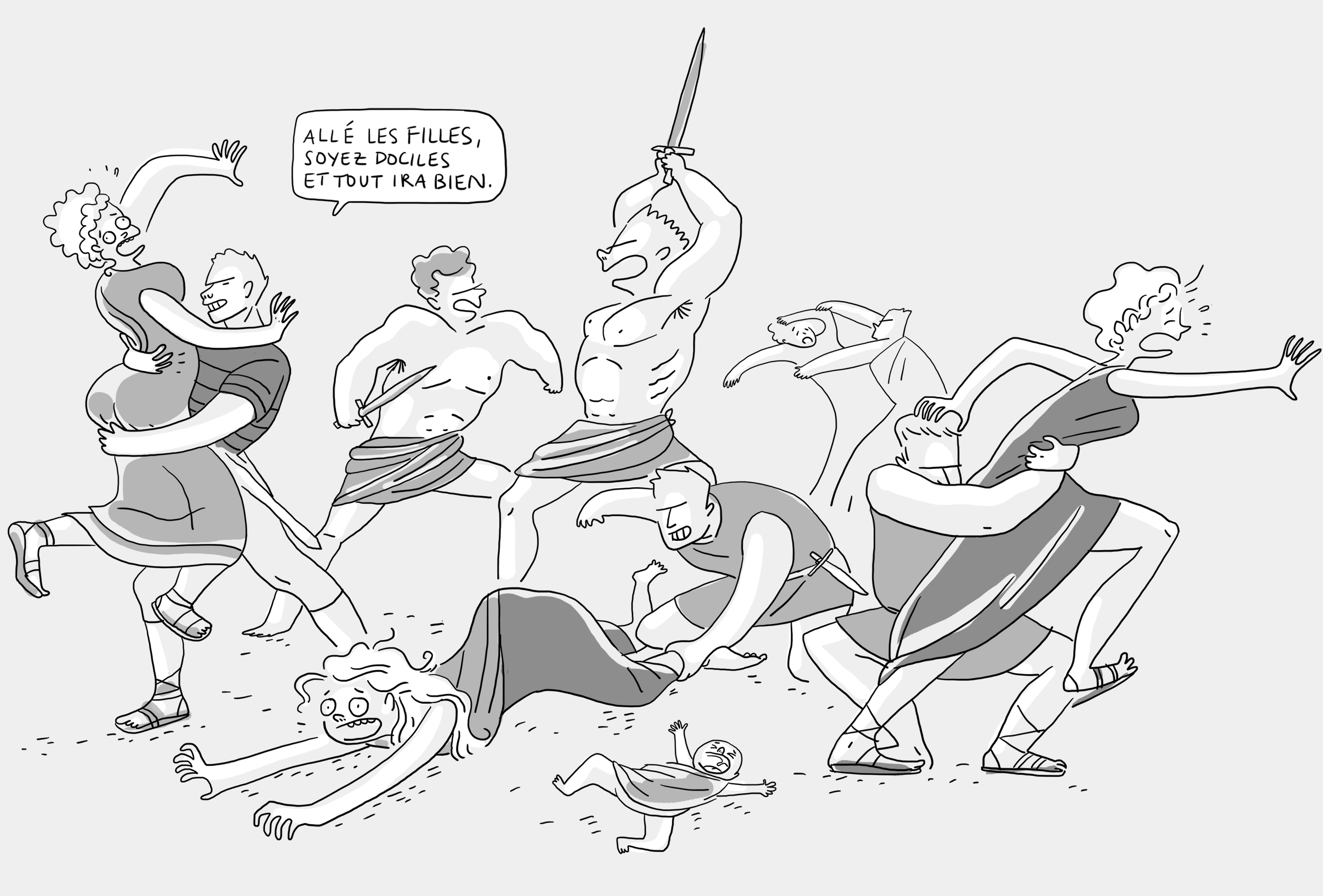 Les Romains, pas très contents, décident alors de leurs tendre un piège pour leur apprendre qui c’est les plus forts. Ils organisent une méga fête en l’honneur de Neptune et invitent tous leurs voisins, dont les Sabins et leurs femmes. Pendant la cérémonie, au signal de Romulus, le romains enlèvent les Sabines et cassent la gueule à leurs maris. Une fois kidnappées et bien attachées, les Romains supplient les femmes de devenir leurs épouses. Selon Tite-Live, historien de la Rome Antique qui a écrit L’Histoire de Rome depuis sa fondation, les Sabines n’ont subis aucun abus sexuels. Romulus leurs à simplement parlé à chacune en leur expliquant que si il y a eu des violences c’est de la faute de leurs maris et qui si elles veulent que tout se passe bien, elle ferait mieux de se la fermer et d’obéir.