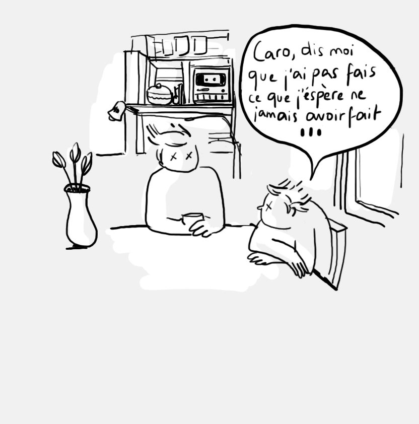 L’expérience de ces jours particuliers, où dès le décollement des paupières, la lumière du soleil est particulièrement douloureuse. Ces matins désagréables où lorsqu’on se réveille l’haleine parfumée et l’oeil vitreux, une flaque de bave nous dit “coucou” sur le matelas. Ce moment où on se jette sous la couette dans un élan de honte en essayant d’oublier ce qui s’est passé la veille. Cette sensation d’inutilité irrécupérable que, personnellement je n’ai encore jamais ressentie: