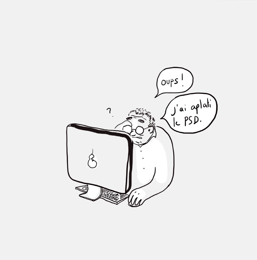 Aplatir un PSD. Copains graphistes, ou ceux qui touchent un peu photoshop sauront tout de suite de quelle douleur amère je parle. Pour les autres, je vais essayer de l’expliquer rapidement. Un PSD est une image travaillée dans photoshop qui peut parfois être très compliquée et surtout demander beaucoup d’organisation. Imaginez par exemple faire un montage photos avec 200 personnes qu’il faut individuellement retoucher. Le but est de pouvoir toujours apporter des modifications à ces personnes ou à l’image, des années après si nécessaire. Donc, aplatir un PSD ça veut dire qu’après 5h de travail passées à suer sur chaque petits détails, à régler chaque ombre, chaque couleur, chaque cheveux, on fait une fausse manoeuvre et…c’est fini. On ne peut plus rien modifier. Pas de retour en arrière possible, on doit tout, je dis bien TOUT recommencer. En général, la seconde qui succède cette étape est composée d’angoisse, de désespoir et de quelques envies de meurtres. J’insiste un peu parce que ça m’est arrivé l’autre jour et j’en saigne encore.