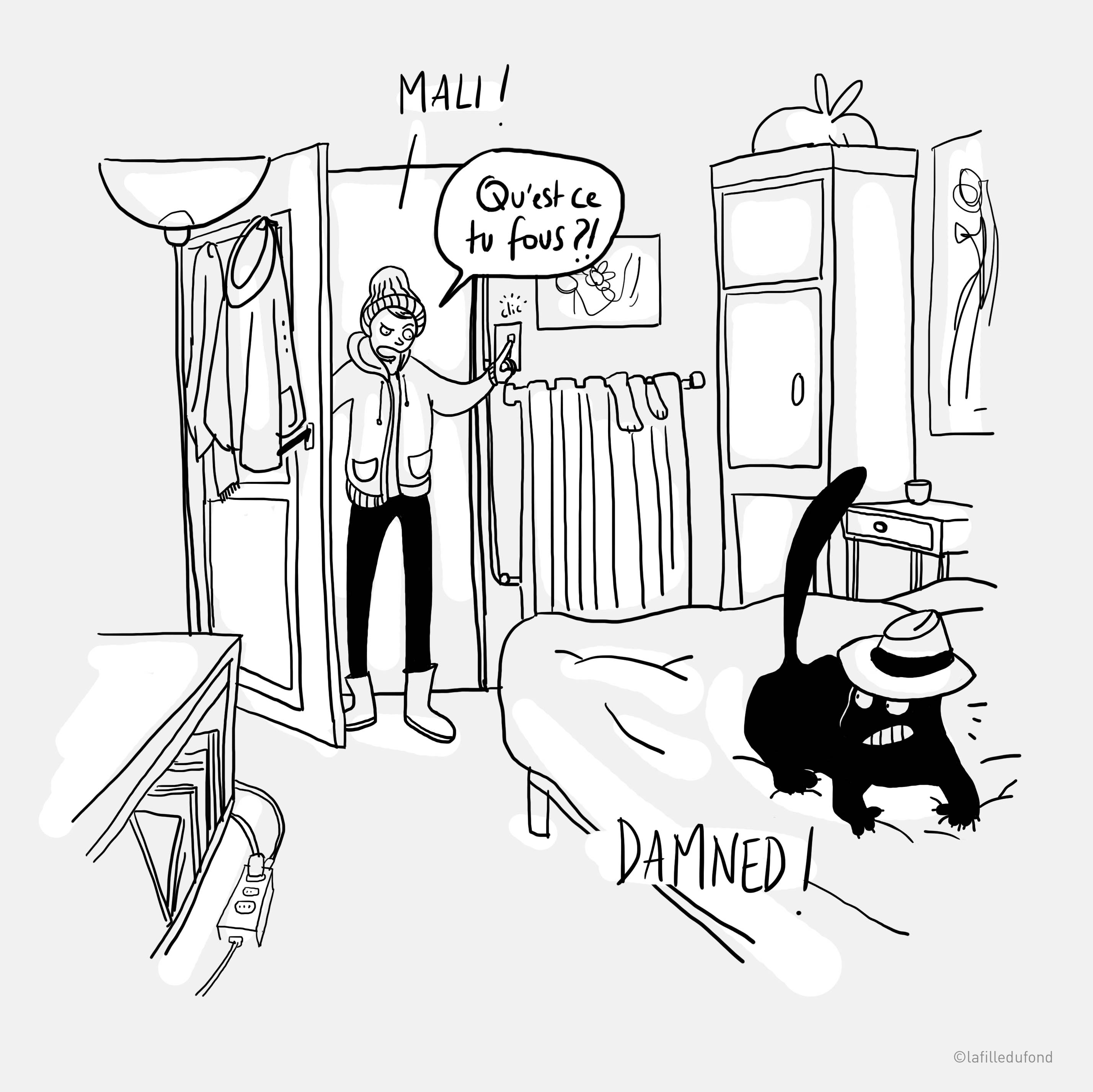 Il faut quand même que je vous dise que dans la vraie vie, ma lumière s’allume par terre, là oú il y a la prise électrique et non au mur comme vous pouvez le voir dans l’avant dernier dessin.