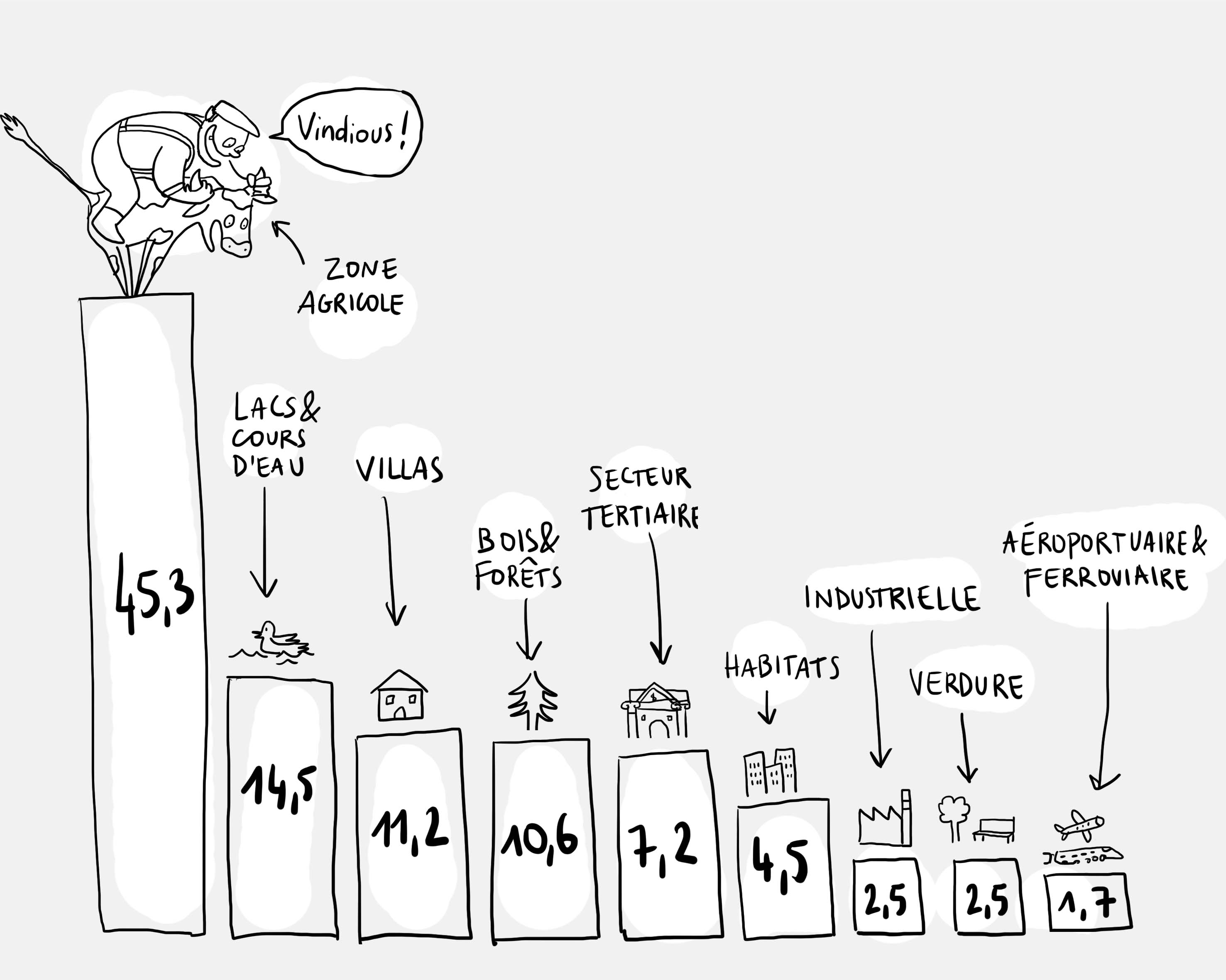 La zone agricole représente 45.3 % de la surface des zones d’affectations dans le canton de Genève. Pourquoi une zone agricole si vaste?? parce qu’en 1920, la législation cantonale gèle les terrains agricoles pour les protéger de l’urbanisation galopante. Du coup la ville se développe principalement intramuros. Une décision honorable, les paysans sont contents et leurs vaches aussi.