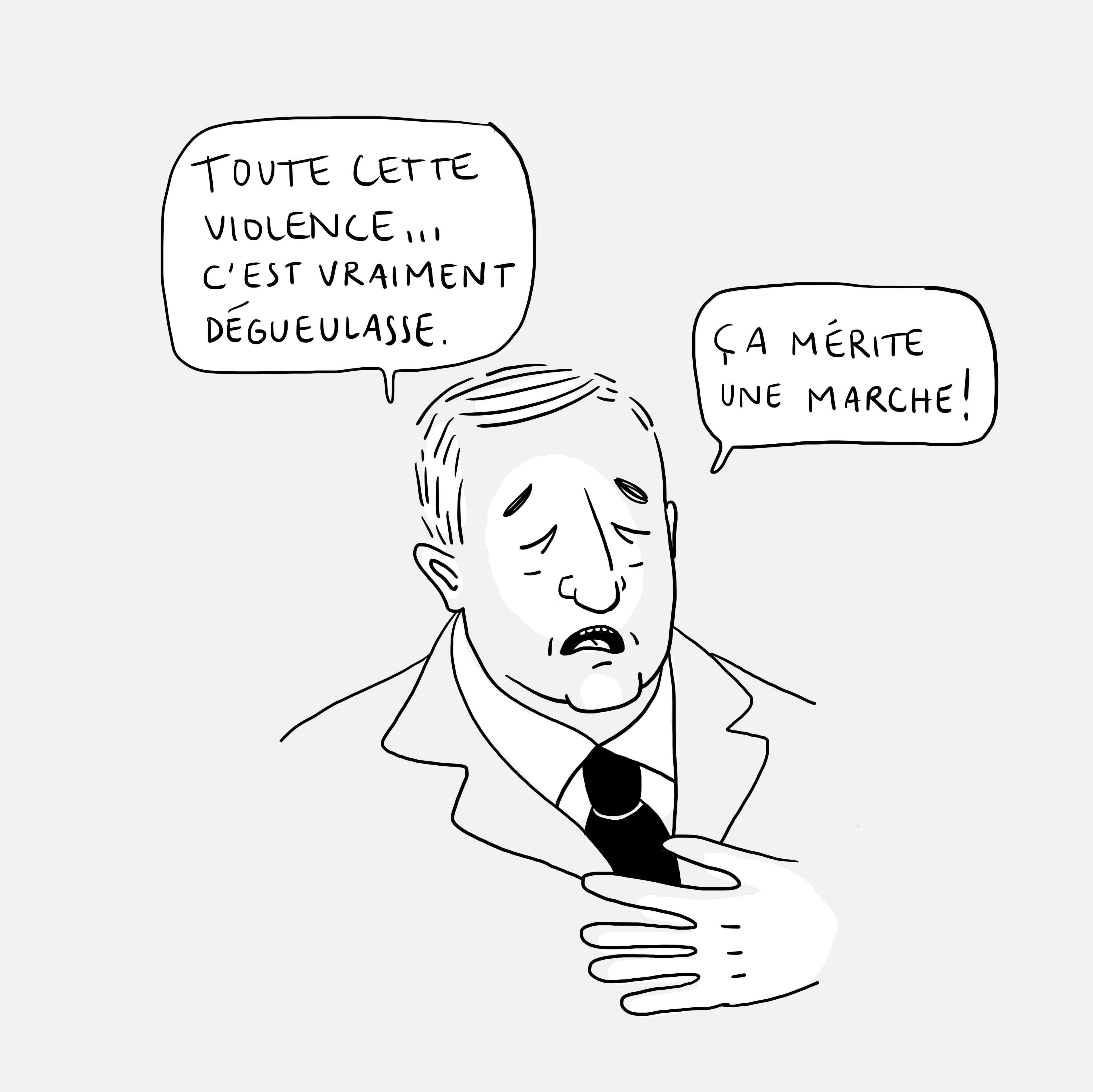 de la tête. Mais ça ne fait rien, on marche, le cœur gonflé contre la barbarie et pour la liberté d’expression. Passé cette petite larme et de retour dans leur pays, les mêmes dirigeants (sauf exception) condamnent sévèrement le journal. Ils en interdisent la publication sur leur territoire car il est soudainement devenu outrageant et blasphémateur.